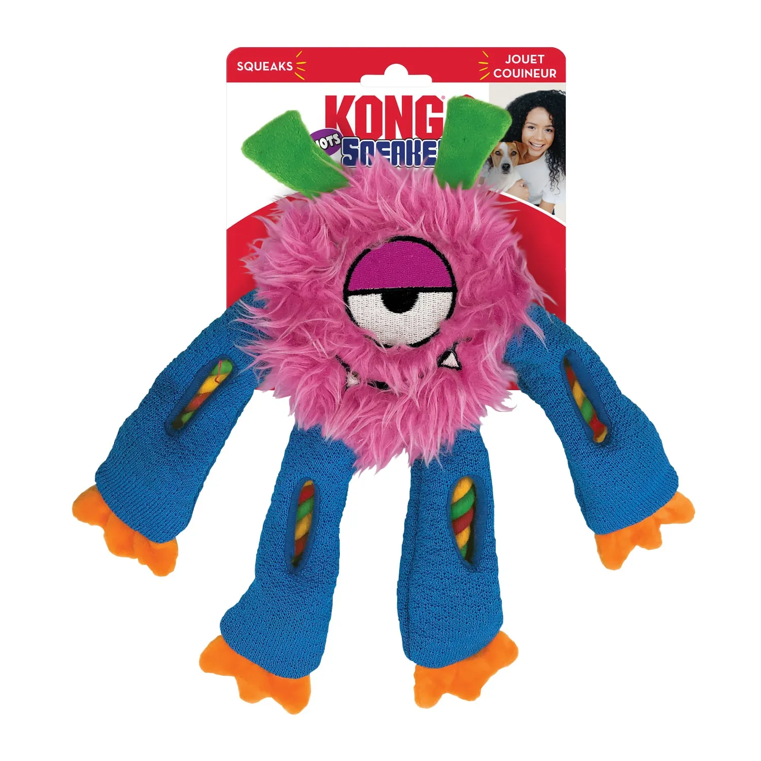Assorted sneaker-style KONG toy with internal rope and dangly legs for tug, shake, chew and squeaky play that keeps dogs curious and happily engaged.
